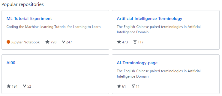 机器之心目前在 GitHub 上也有三个项目,分别是评估人工智能各领域优秀公司的 AI00、人工智能领域中英术语集和模型试验与解释项目。