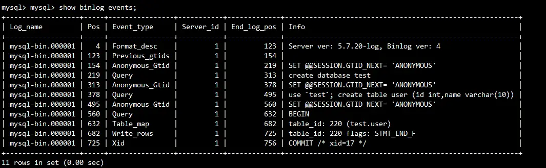 show binlog events in 'mysql-bin.000002';查看指定的日志文件