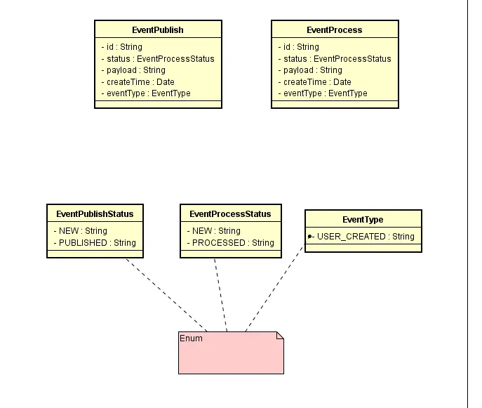 这两个问题的本质是: 如何让操作数据库和操作消息队列这两个操作成为一个原子操作. 不考虑2PC, 这里我们可以通过事件表来解决这个问题. 下面是类图.