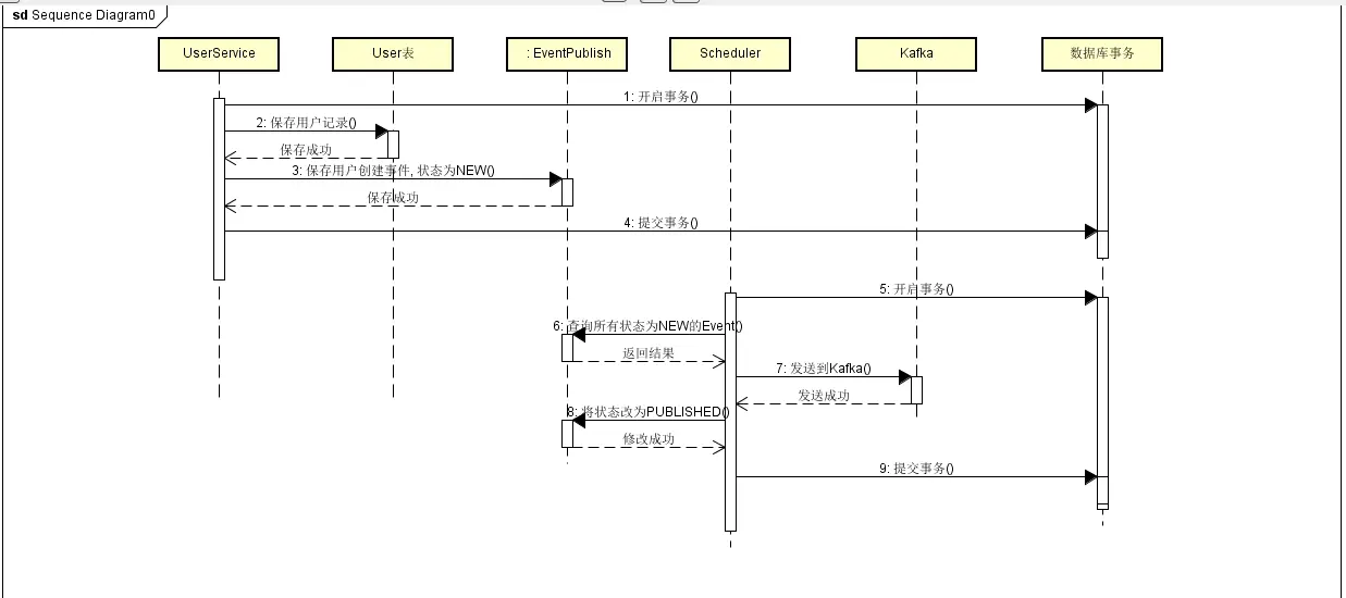1. 用户服务在接收到用户请求后开启事务, 在用户表创建一条用户记录, 并且在EventPublish表创建一条status为NEW的记录, payload记录的是事件内容, 提交事务.