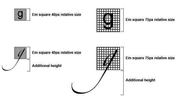一款字体会定义一个 em-square,它是用来盛放字符的金属容器。这个 em-square 一般被设定为宽高均为 1000 相对单位,不过也可以是 1024、2048 相对单位。