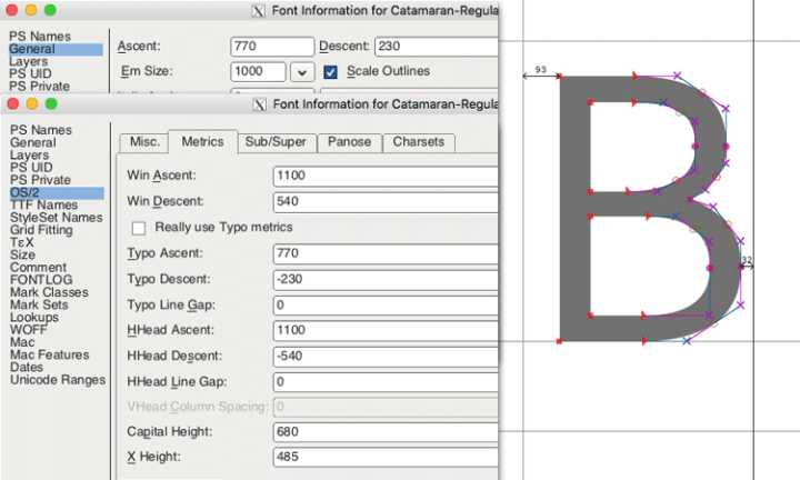 我们回到 FontForge,Catamaran 的 em-square 高度是 1000,同时我们还看到很多其他的 ascender/descender 值:
