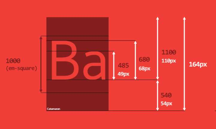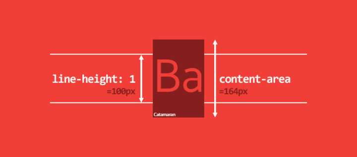 这意味着 Catamaran 字体占据了 1100 + 540 个相对单位,尽管它的 em-square 只有 1000 个相对单位,所以当我们设置 font-size:100px 时,这个字体里的文字高度是 164px。这个计算出来的高度决定了 HTML 元素的 content-area(内容区域),后面我会讲到 content-area。你可以认为 content-area 就是 background 作用的区域。
