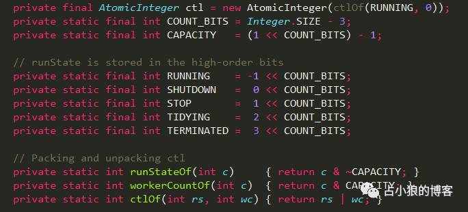 其中AtomicInteger变量ctl的功能非常强大:利用低29位表示线程池中线程数,通过高3位表示线程池的运行状态: