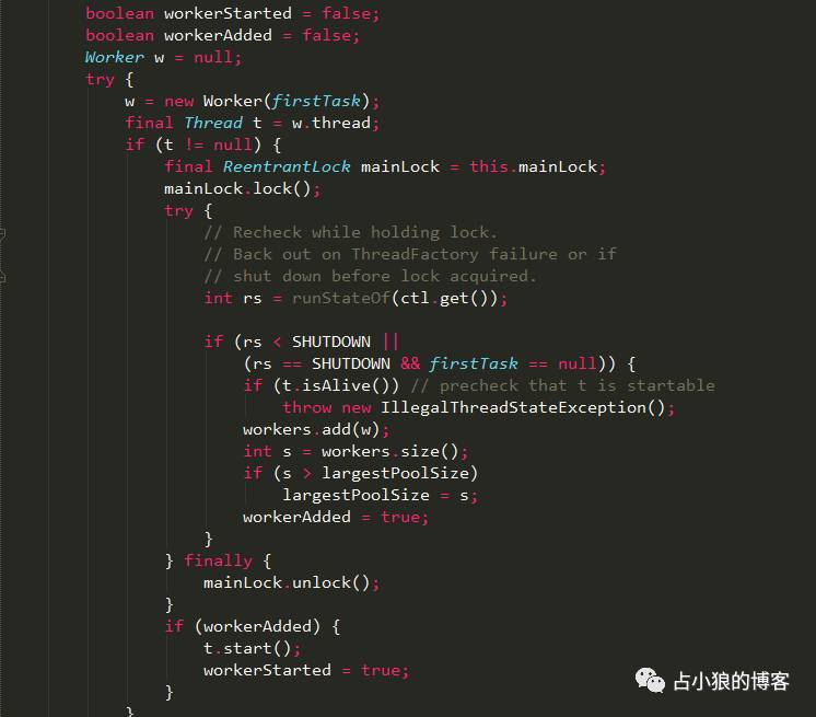从方法execute的实现可以看出:addWorker主要负责创建新的线程并执行任务,代码实现如下: