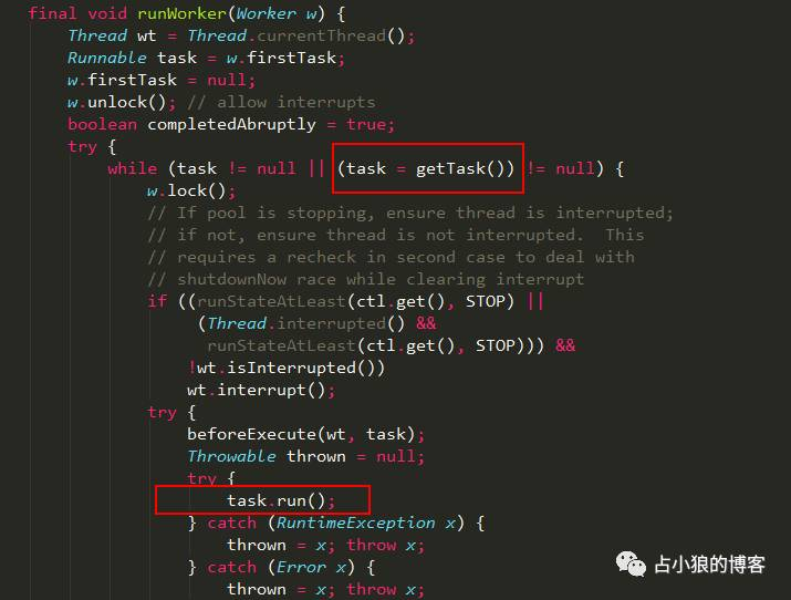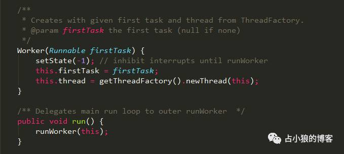 从Woker类的构造方法实现可以发现:线程工厂在创建线程thread时,将Woker实例本身this作为参数传入,当执行start方法启动线程thread时,本质是执行了Worker的runWorker方法。