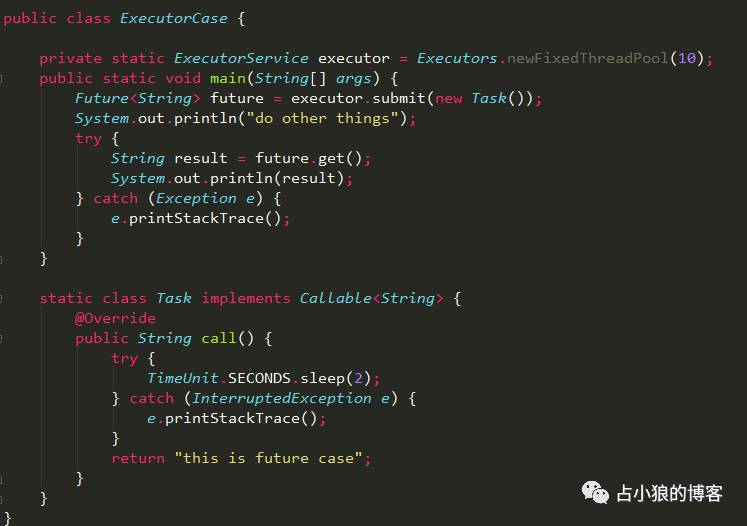 在实际业务场景中,Future和Callable基本是成对出现的,Callable负责产生结果,Future负责获取结果。