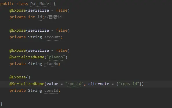 1.反序列化的时候 如字段名大小写不一致 或者完全不一样 如DataModel 中使用@SerializedName("planno") 、 @SerializedName(value = "consid", alternate = {"cons_id"})