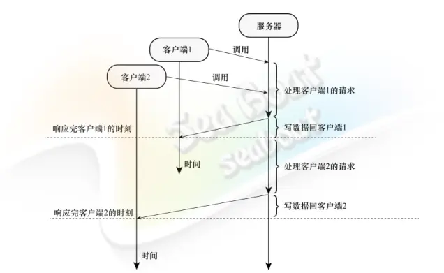 首先,服务器必须初始化一个套接字服务器,并绑定某个端口号并使之监听客户端的访问。接着,客户端1调用服务器的服务,服务器接收到请求后对其进行处理,处理完后写数据回客户端1,整个过程都是在一个线程里面完成的。最后,处理客户端2的请求并写数据回客户端2,期间就算客户端2在服务器处理完客户端1之前就进行请求,也要等服务器对客户端1响应完后才会对客户端2进行响应处理。