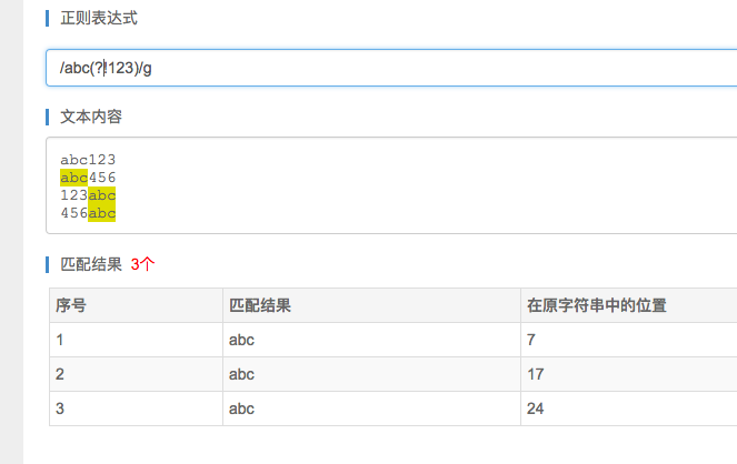 想要匹配abc并且abc的后面不是123的表达式,应该这样: