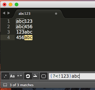 想要匹配abc并且abc的前面不是123的表达式,应该这样: