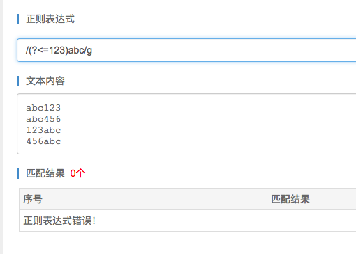 想要匹配abc并且abc的后面是123的表达式, 尴尬的是js不支持后顾,只支持前瞻,所以用js匹配会这样:
