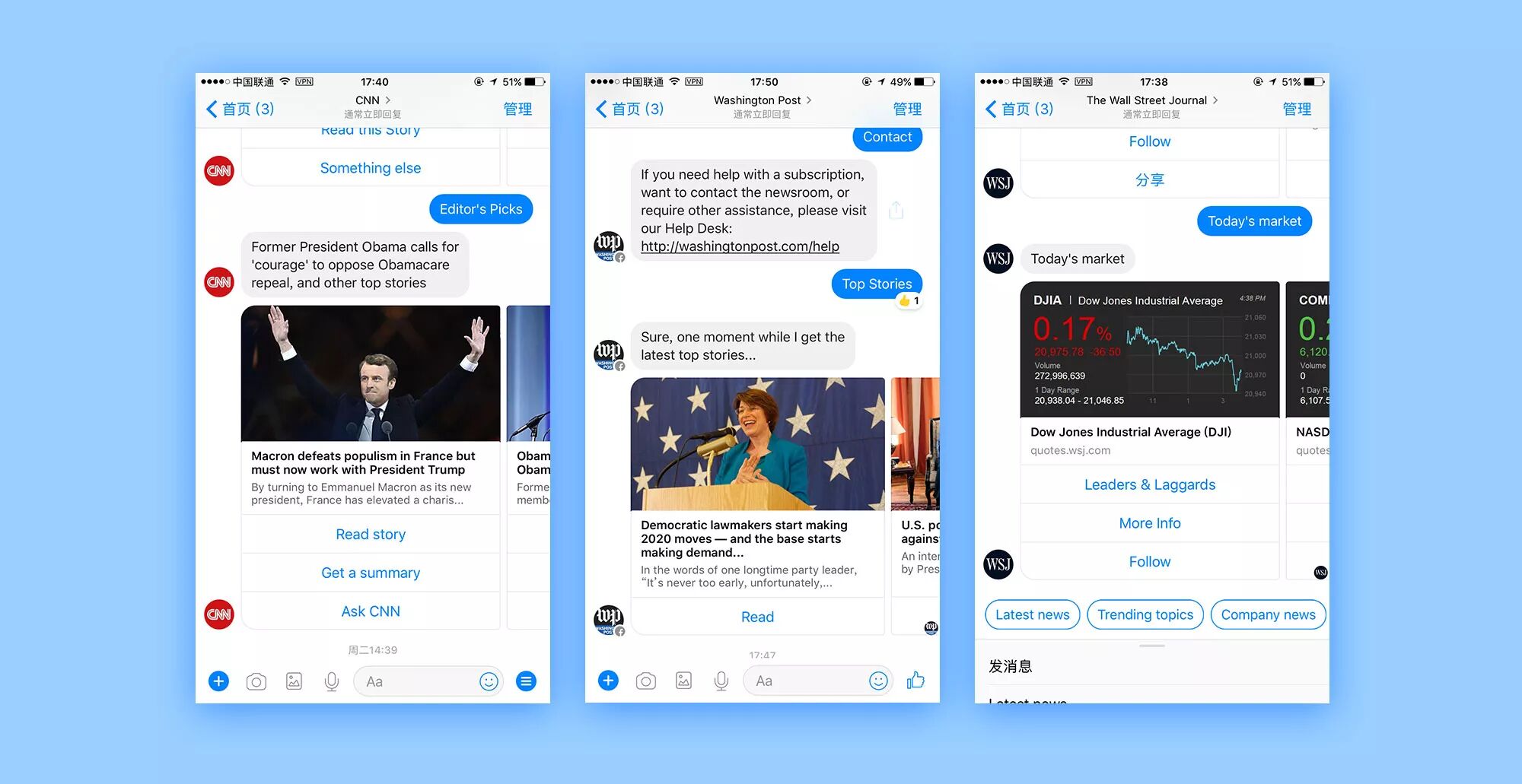 在facebook聊天机器人的交互规范里,提到开发者最好发送一些结构化消息帮助用户完成任务,获取信息或者回复用户的疑惑。上图中可以看到,针对一则新闻他们以图片+标题+按钮的形式(也可以是纯文本+按钮的形式)。让用户不用过多的思考,就可以选择他们是否想继续看新闻详情,还是只是想获取该新闻的梗概,或是让机器人再给你推送一些别的新闻。