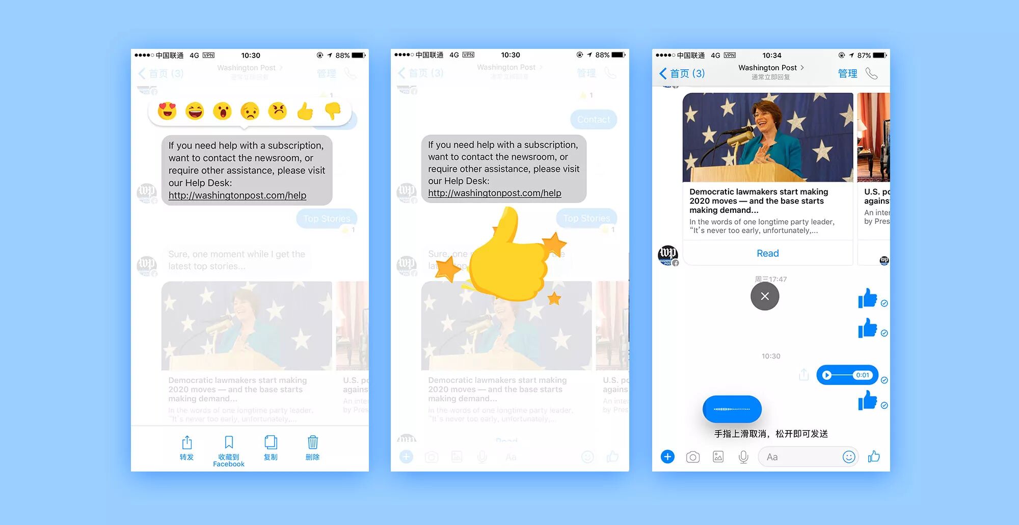 messenger chatbot借助其平台的优势,人机对话也保留了和普通用户对话时的很多有趣的功能。比如能针对某段话进行点赞,有7种情绪表情可以使用,点击情绪表情后的动效也使得功能增色不少。小疯机器人的平台也可借鉴这种功能,用户能对小疯的某段回复进行有针对性的反馈标记,比如设计几种情绪表情“不感兴趣”“喜欢”“忧伤”等贴在回复上,可以帮助小疯进行机器学习。