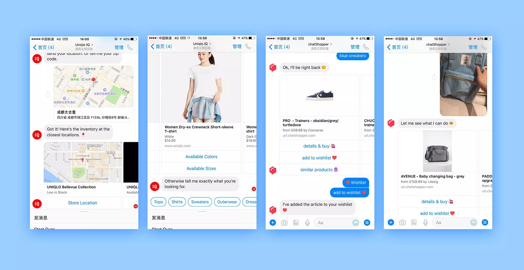 相比Uniglo IQ , chatShopper更像一个时尚顾问,它不会像Uniglo IQ一样按照类目层层筛选东西给你,它一上来就会问你要不要看看这批“blue sneakers” ,你看到喜欢的可以直接购买,也可以加入心愿单。或者你还可以传一张图片让它给你找相似款。
