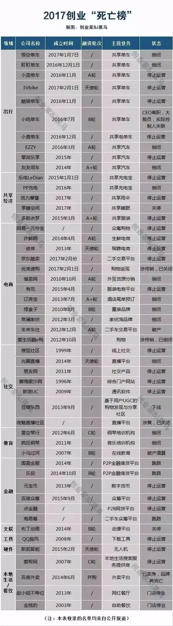 2017年即将结束,我们盘点了这一年中未能活下来的创业项目,历来称作“创业死亡榜”。其中,你能看到的项目的创始人,在启动之时大多饱含热忱,死亡来临前一刻也曾奋力争取生机。