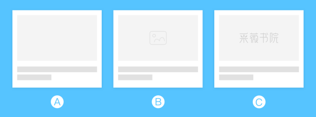 下图为加载默认图的三个方案:A方案为纯灰色默认图,B方案为带有图片icon的默认图,C方案为带有产品logo的默认图。其实三种方案我们在市场产品中都经常见到,从视觉层面来讲C方案更优,它不仅实现了加载默认图的功能,而且增加了品牌的曝光率,使设计更具有价值。