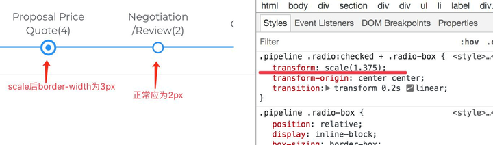 这个圆圈是用border-radius: 50%画出来的,所以width/height变大的时候,圆圈的半径就会变大,但是在变化的过程中变形了。如果改成用padding做动画,效果也一样,那怎么办呢?一个方法是把动画时间调小一点,这样看起来会减轻,但终究不是根本解决办法。