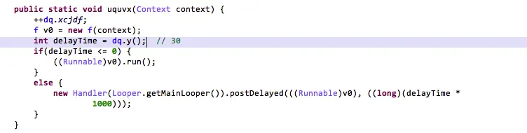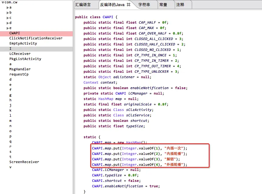 2.访问http://mail[.]zbmcc.cn/s获取插件Json数据。数据如下,a:插件包下载地址;b:版本号;c:设备sd卡存放位置;d:恶意弹窗控制指令数据,函数call的参数。 { "a": "http://d2[.]chunfeifs[.]com/jfile/ter.jar", "b": "5.0", "c": "download/br/", "d": "1=2,1;3=2;4=2,1;7=3,2,1,30;8=1,1;" } 3.插件下载地址来自xiongjiong[.]com或chunfeifs[.]com。成功下载后,随后动态加载ter5.0.jar,并反射执行“init”方法完成恶意推广行为初始化,下图“CWAPI”的静态代码块,可知DowginCw的弹窗方式。