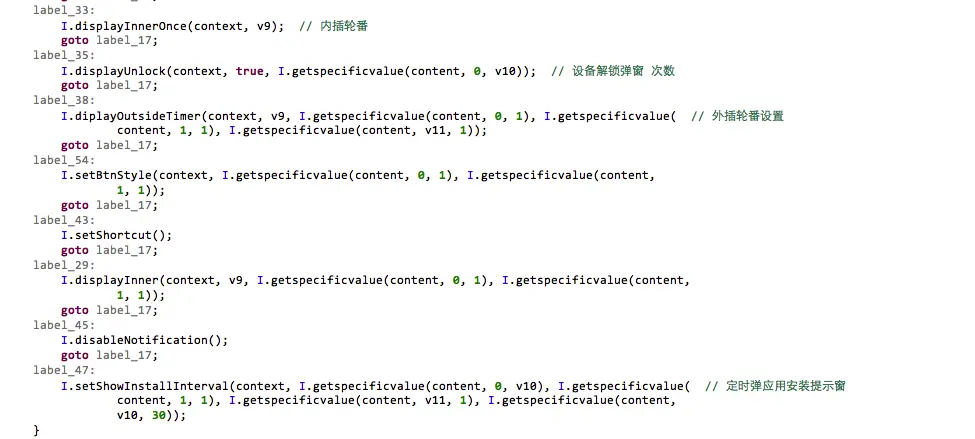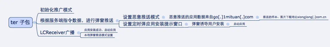 设置恶意推送模式和定时弹应用安装提示窗的指令数据,来自mail[.]zbmcc[.]cn返回的json数据中的b字段值,例如数据指令“1=2,1;3=2;4=2,1;7=3,2,1,30;8=1,1;”会开启以下3种推送模式和设定弹应用安装提示窗口定时器: