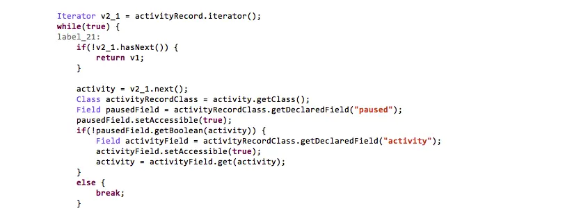 为了能够在设备解锁,任意应用界面弹窗,病毒需要获取当前运行Activity实例。“DowginCw”通过反射获取ActivityThread中所有的ActivityRecord,从ActivityRecord中获取状态不是pause的Activity。