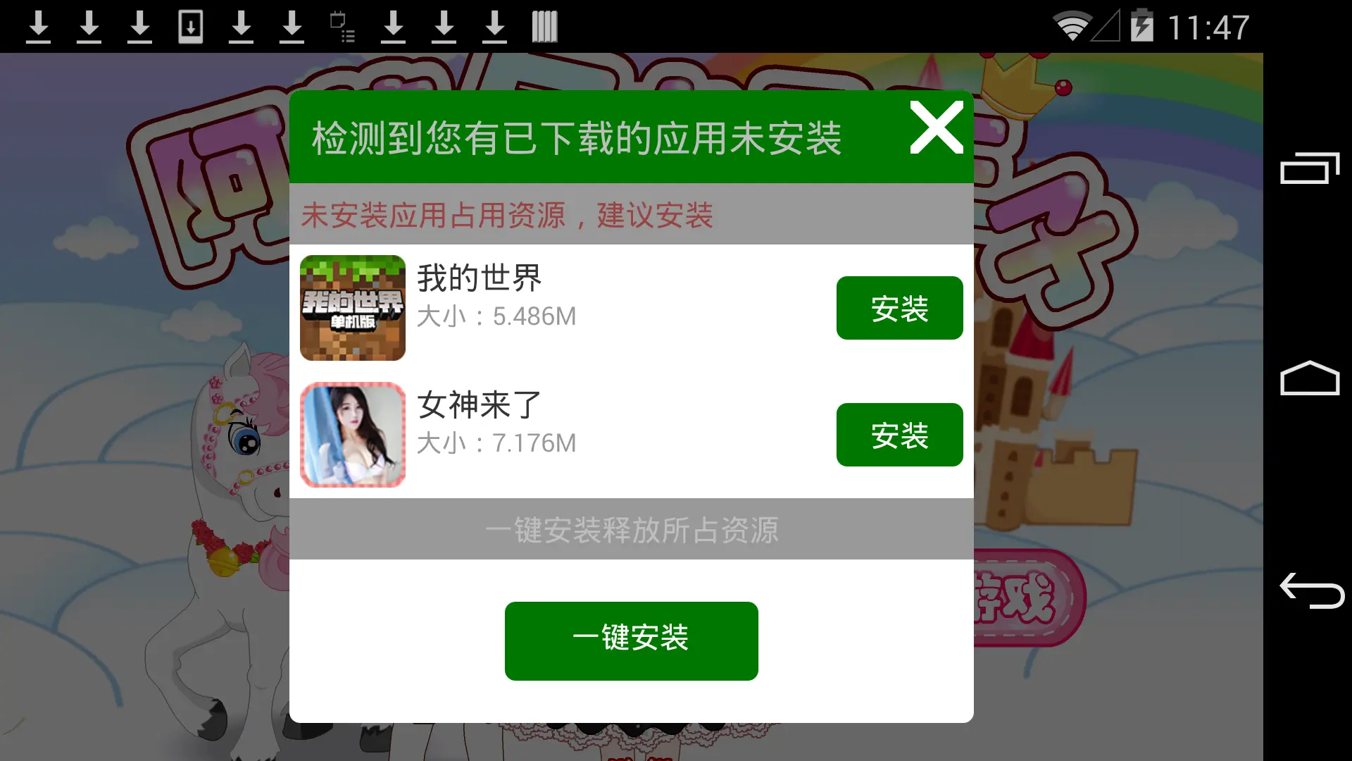 成功弹出恶意推广窗,用户触屏图片区域,甚至点击“取消”也会下载准备的应用。
