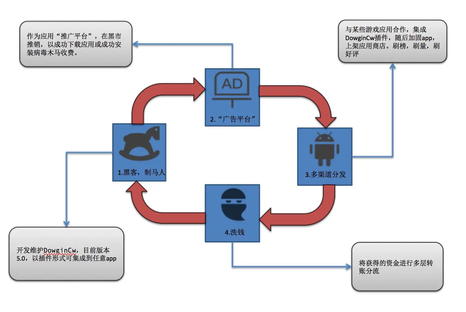 如下图所示,由制马人、广告平台、多渠道分发、转账洗钱构成了“DowginCw”黑色产业链的关键环节。