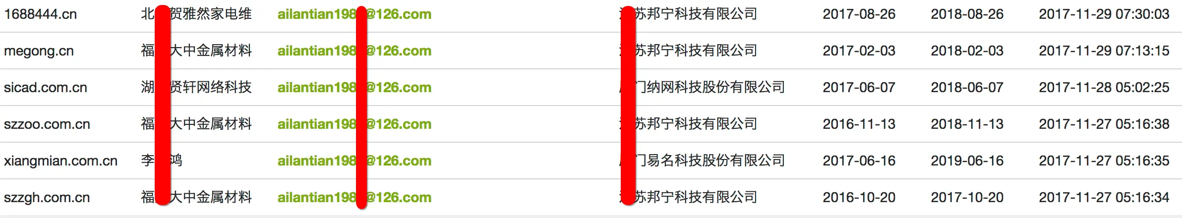 1、黑产团伙使用ailantian198*@126.com、lantian198*@foxmail.com、30854789*@qq.com作为“DowginCw”域名地址的公共邮箱,并使用这些邮箱注册大量其他恶意域名。