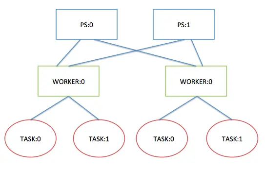 - 通过以上配置可以快速建立起如下图所示的多机多卡多PS计算网络结构,其中PS为Parameter Server服务,WORKER为计算节点机器,TASK表示具体执行计算的GPU卡: