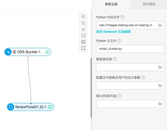 - 将mnist_cluster.tar.gz文件下载并上传到OSS(本文下部提供下载地址),配置深度学习的OSS读取权限,拖拽任意版本TensorFlow组件按照下图连接,设置对应的代码数据源(Python代码文件设置mnist_cluster.tar.gz路径,Python主文件填入mnist_cluster.py):
