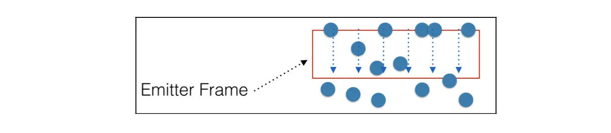 Line shape 一个发射器形状的kCAEmitterLayerLine在发射器框架的顶部创建了所有的粒子。这是一个对瀑布效应有用的发射器形状;水颗粒出现在瀑布的顶部边缘,像这样瀑布向下。