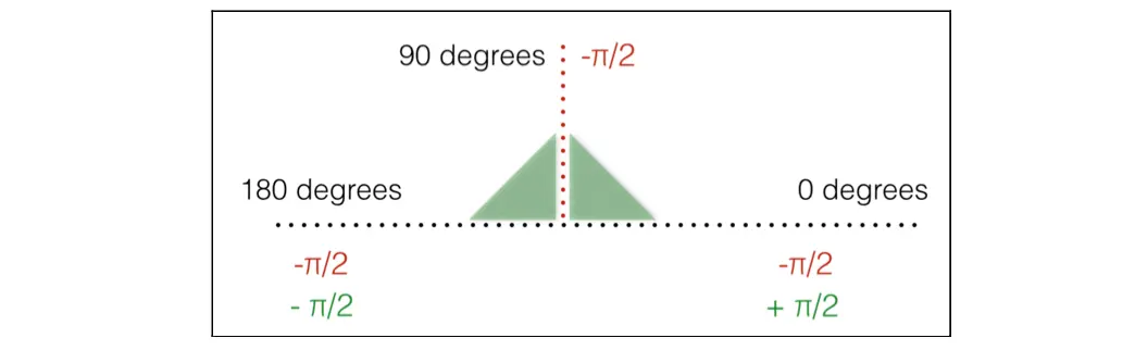 起初,你把所有的粒子都配置成直线向上(以-π/2角度)。上面的代码指示发射器为每一个粒子(-π/2 - π/2)=180度,(-π/2 + π/2)=0度,如下图所示:
