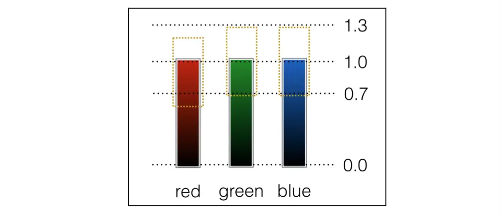 绿色和蓝色的组件值现在是0.7到1.3之间的随机值;但是,超过1.0的值被限制在1.0,所以有效范围是0.7到1.0。由于“正常”值为0.9,红色组件将被限制在0.6到1.0之间。这些是比较窄的范围,因此产生的随机颜色仍然很轻。如图: 当然还可以把粒子颜色范围弄小点