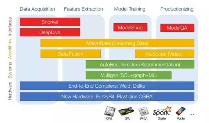 而 DAWN 的目标,不是为了改进 ML 算法,因为对于许多重要的应用程序来说,算法已经足够完善,而是使 ML 能够为小型团队所用,非 ML 专家也可以应用 ML 解决他们的问题,实现高质量的结果,并部署可以在特定应用中使用的生产系统。我们的问题是:如何能够让所有具备专业知识的人建立属于自己的高质量数据产品(而不需要一群不了解最新硬件系统的机器学习、大数据或分布式系统专业的博士)?总之,就是让 AI 普及。