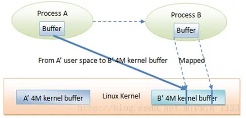 从Android进程架构角度分析:对于消息队列、Socket和管道来说,数据先从发送方的缓存区拷贝到内核开辟的缓存区中,再从内核缓存区拷贝到接收方的缓存区,一共两次拷贝,如图: