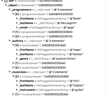 容器类遵循SYYJSonAbstractBuilderInterface.h协议,协议里有增加,删除属性的方法,可以对类属性做处理,demo里并没有做类似的封装,感兴趣的同学可以自己实现。为构造器设置键值,就是针对数据的最外层键值进行指定,然后对构造器指定资源,资源一般的字典数据类型,然后指定资源中键值,如测试数据中的programmers,authors,musicians,最后是就是解析,解析过程就是通过一层层进行遍历,通过kvo赋值,如果是数组类型或者字典类型,会进一步做遍历,直至遍历到我们指定类,即我们要最终转化的类型,从而得到最终的模型对象。