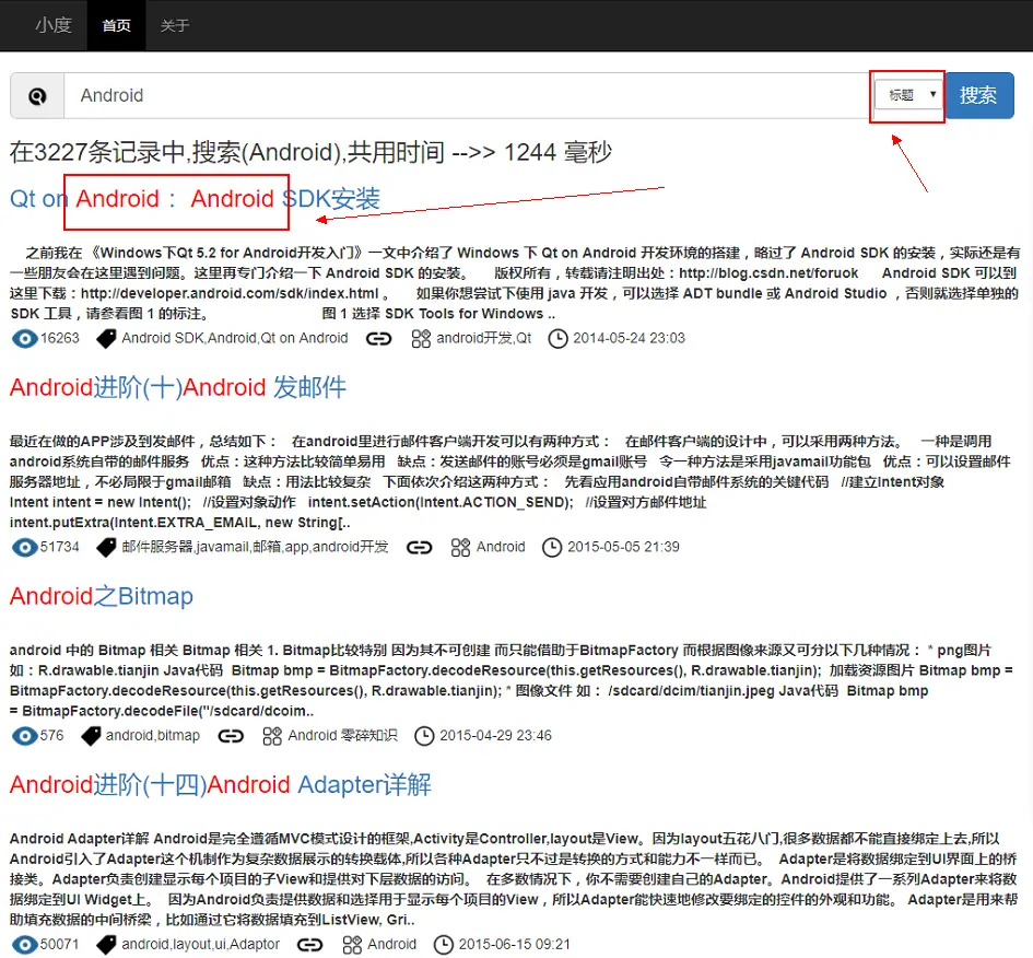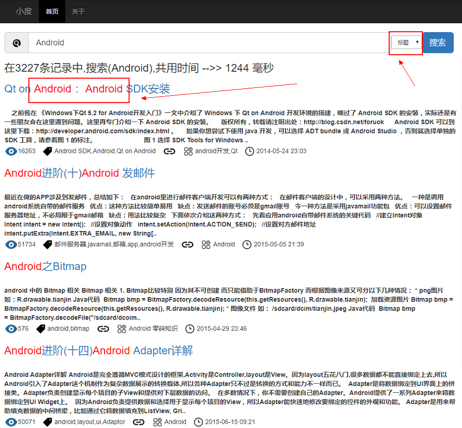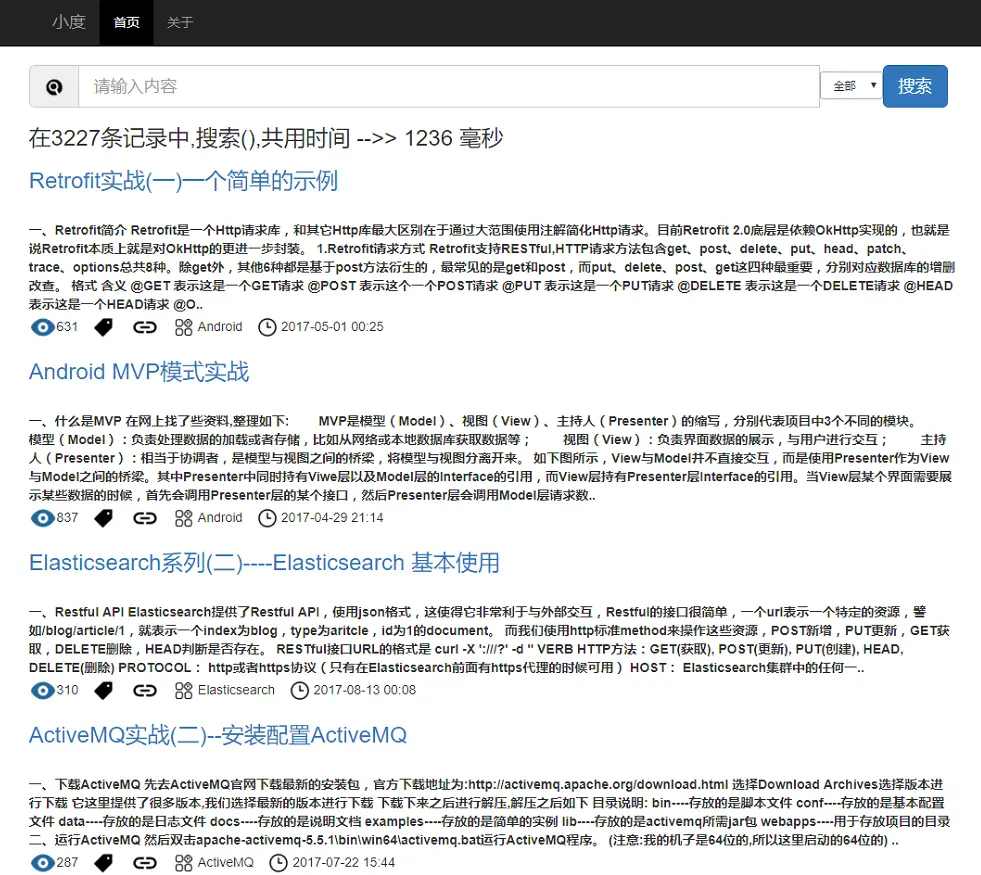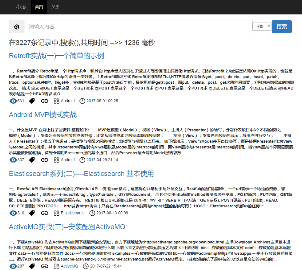所有的数据都是用webmagic爬虫进行爬取得,然后使用Logstash-input-jdbc同步数据库中的数据到ES,具体可参考我以前的文章。