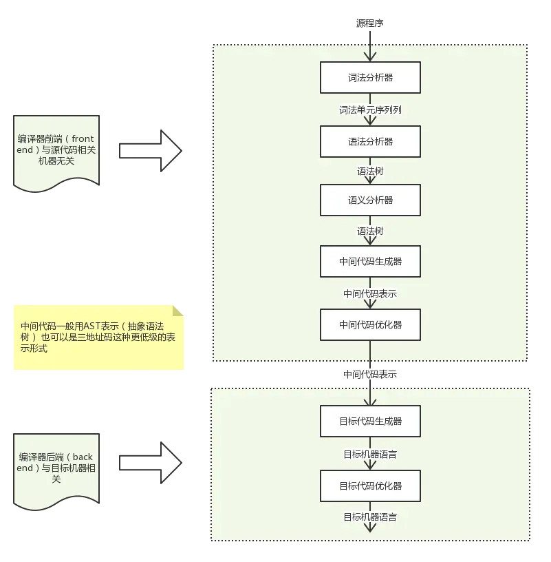 前后我们提到实现DSL的理论基础是编译原理,根据wikipedia的定义:编译器是将一种计算机语言编写的源程序转换成另一种计算机语言的计算机程序。通常编译器的主要任务就是将使用高级语言编写的源程序,编译成机器可识别的机器语言。要实现对源程序的编译,编译器需要经过以下的处理阶段,如图: