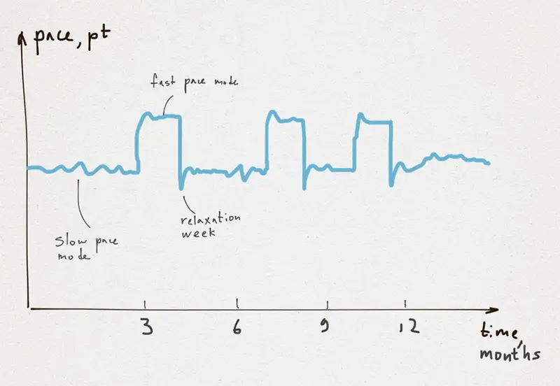 我不是在谈论迭代式发展。事实上,迭代开发可以同样应用于中等冲刺或马拉松模式,间隔开发就是混合模式。短时间内,你可以做冲刺,然后切换到马拉松模式。在我看来,好的时间表可以是: