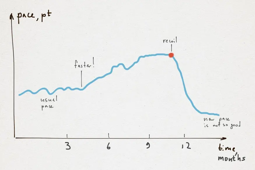 也许你能保持每月 100 分的速度三到六个月,但是这几乎不可能保持一年。而且随着高速发展,阻力会明显增强。终有一天你会后悔你做过的一些。