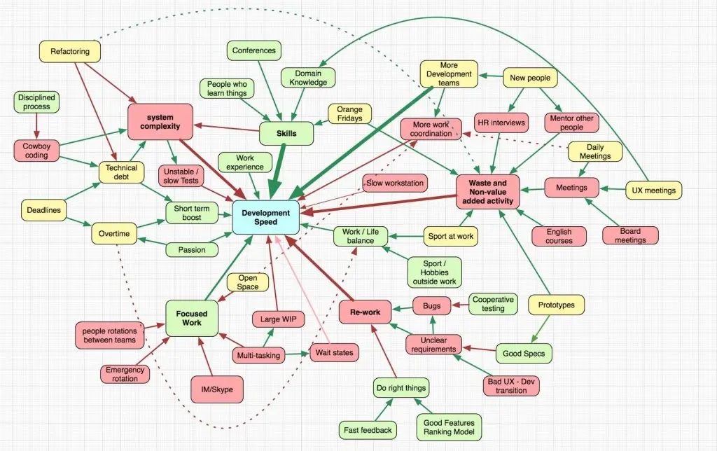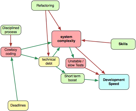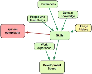 红色箭头表示减少的效果,例如,更好的开发技巧减少系统的复杂度(好的工程师创造更少复杂的系统)。