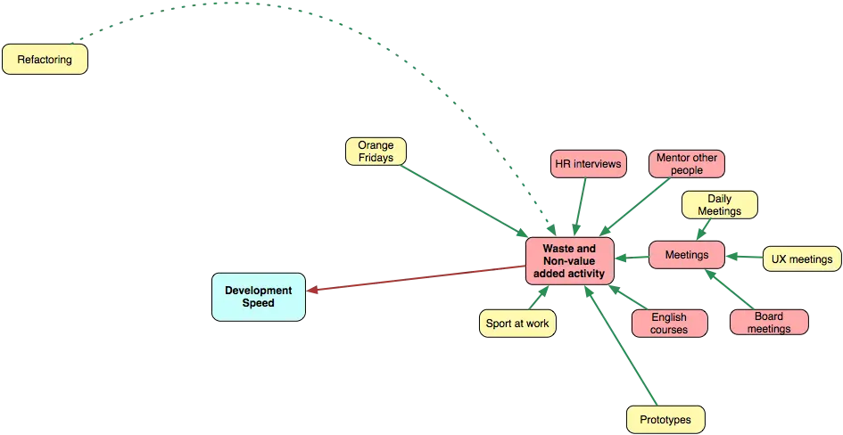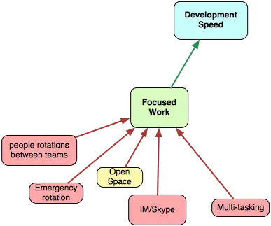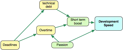 这张图显示了默写事情和影响开发速度的活动,绿色意味着增加速度的活动,你拥有越多越好。黄色表示存在一些最大值,例如,你可以积累技术债务和提高速度,但是如果积累太多,会显著减慢你的速度。红色表示的是减慢开发的事情,他们越少越好。然后,绿色箭头表示增加的效果,例如,专注工作会提高开发速度。