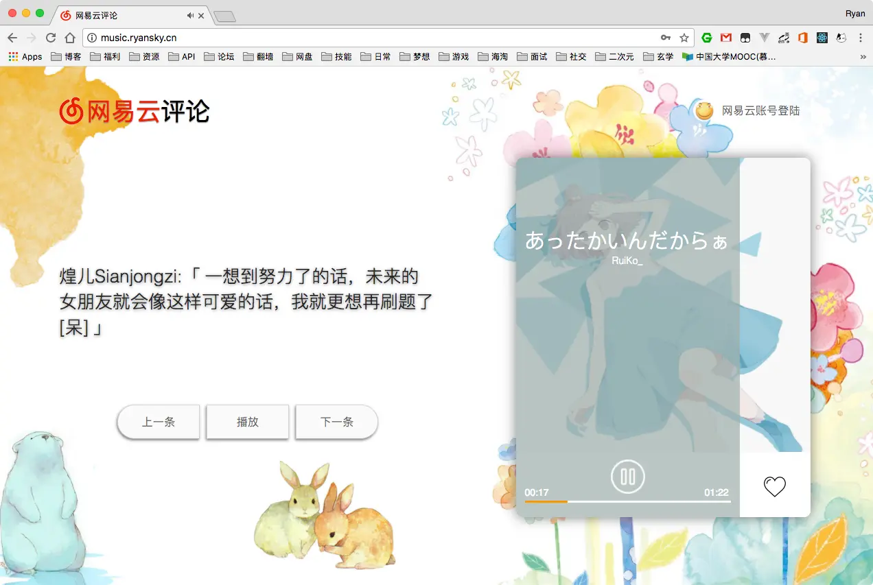网易云评论 Ryanhui8542 2017-12-25 158 阅读1分钟 随机展示一首歌的第一热评,如果觉得有意思就听听这首歌。 以上就是唯一的功能。 哦,还能点个收藏。 预览地址在此,pc端浏览 老夫,是不是很少女? 我看药丸。 代码:github -> React 和一个Api: NeteaseCloudMusicApi