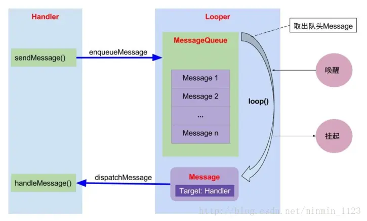 Handler将Message发送到Looper的成员变量MessageQueue中,之后Looper不断循环遍历MessageQueue从中读取Message,最终回调给Handler处理。如图: