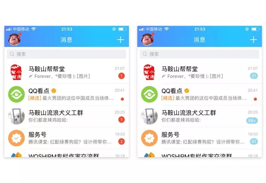 以使用场景为例,同样的一个群消息提醒,是否开启了免打扰模式的小红点的样式是不一样的,这里主要的不同是小红点的背景色。