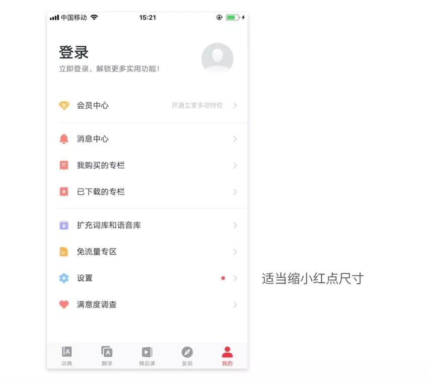 其实对于小红点的使用,我们一定要慎重。因为小红点的工作原理就在于用户心中对于和谐统一界面的追求,突然这里出现了一个红点,总是会忍不住地想去点击。我们可以适当的降低小红点的尺寸,或者使用一些微动效来缓解用户内心对于这个小红点的烦躁心理。