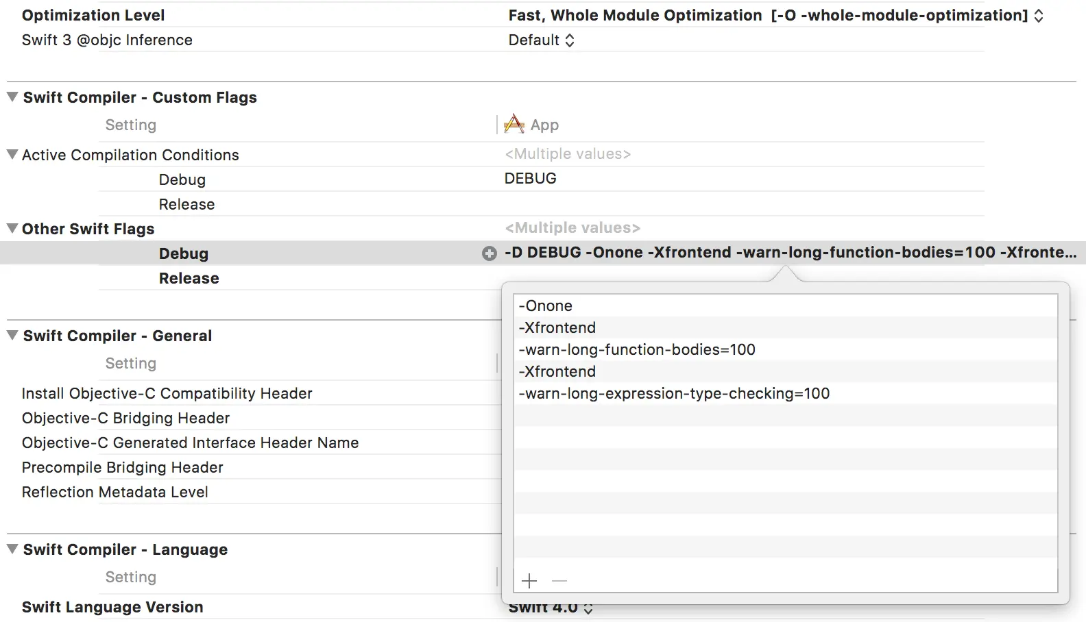-Xfrontend -warn-long-function-bodies=100(100意味着 100 毫秒, 这个数字具体设置多少要依电脑配置和项目大小而定,建议多调整几遍找到大小相对合适的数字,ps: 1 秒= 1000 毫秒)-Xfrontend -warn-long-expression-type-checking=100