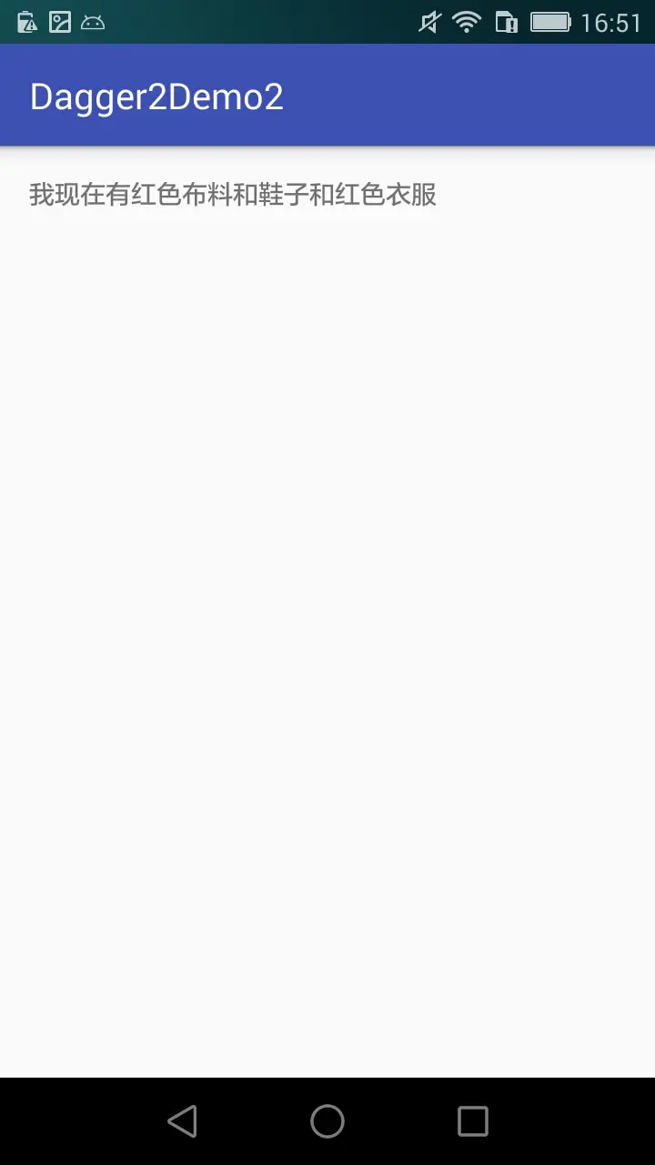 我们现在只是声明了Component类,但我们要怎么将Component类和依赖需求方对象联合起来呢?答案就是通过这个inject方法,这个方法可以将依赖需求方对象送到Component类中,Component类就会根据依赖需求方对象中声明的依赖关系来注入依赖需求方对象中所需要的对象,本Demo中MainActivity中需要Cloth对象,所以我们通过inject方法将MainActivity实例传入到MainComponent中,MainComponent就会从MainModule中的getCloth方法获取Cloth实例,并将该实例赋值给MainActivity中的cloth字段.相当于你去商店的道路,没有这条路,你就无法去商店和老板说明你所需要的东西.但是这里需要注意的是,inject方法的参数不能用父类来接收,例如本Demo中,如果inject的参数是Activity,那么Dagger2就会报错.