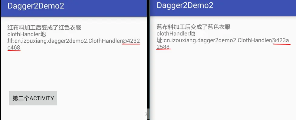 这里我们发现,虽然第一个Activity使用的是@subcomponent方式,第二个使用的是dependencies依赖的方式,但是ClothHandler还是实现了单例,出现这个原因我们上面也讲到了,因为这两个Activity中用到的BaseComponent是同一个实例,因为在BaseComponent中ClothHandler是单例的,那么通过BaseComponent提供的ClothHandler的肯定也是单例的嘛