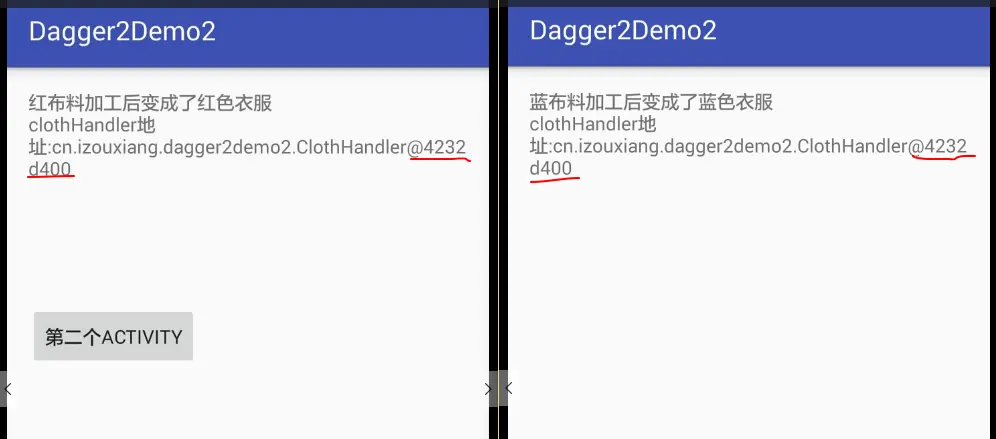我们成功的将ClothHandler注入到了这两个Activity中,并且还实现了单例.(注意:这里能实现单例跟BaseComponent中声明了@Singleton有很大关系,因为BaseComponent都没有单例的话,外部依赖它的Component就更不可能单例了).
